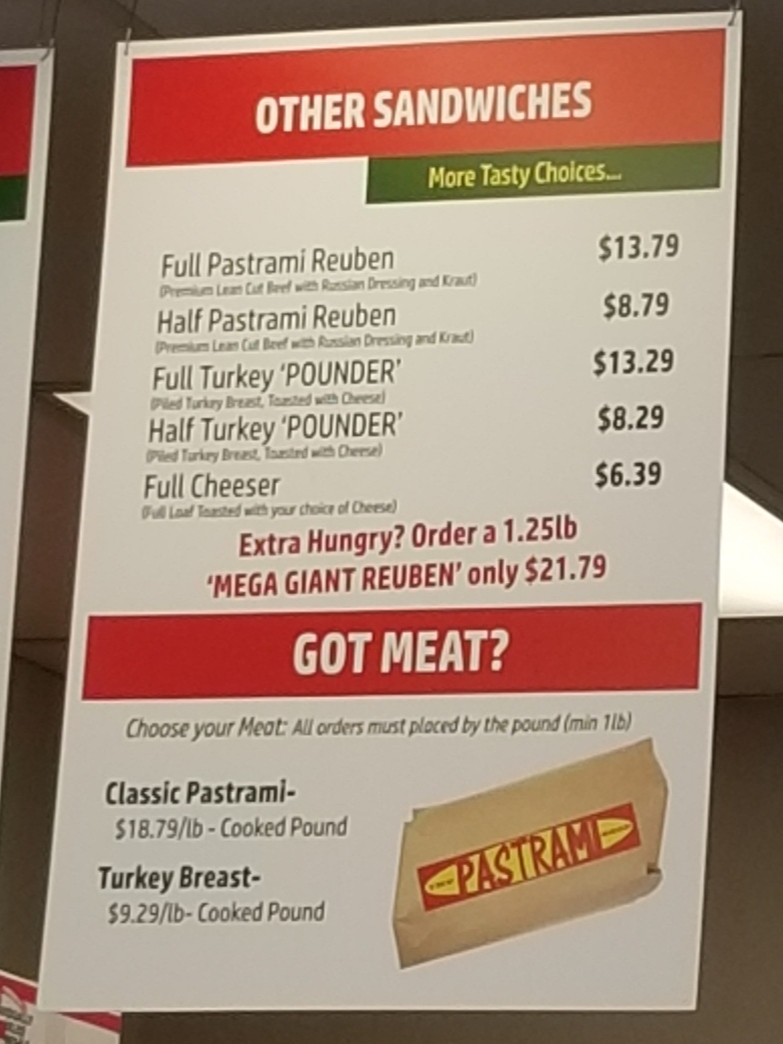 Meat by the Pound: For those looking to purchase deli meats in bulk, options include Turkey Breast, Classic Pastrami, and Pepperoni/Salami, all served by the pound.